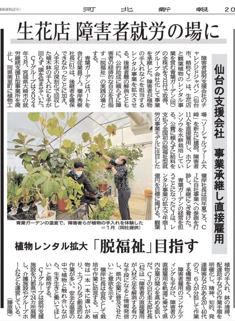 この度、株式会社チャレンジドジャパンは、2026年3月3日付で、生花販売および観葉植物レンタル事業を営む「青葉ガーデン」の全株式を取得し、事業を承継いたしましたことをお知らせいたします。