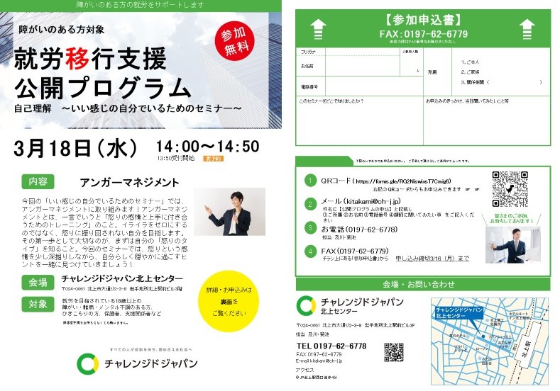 日時は3月18日(水)の14時から14時50分まで、会場はチャレンジドジャパン北上センターとなります。「就労移行支援ってどんなことをするんだろう?」「事業所の雰囲気を知りたい」「就職に向けて何か始めたいけど、何から手をつければいいかわからない」といった疑問や不安をお持ちの方に、ぜひご参加いただきたいイベントです。見学を兼ねて、お気軽にお越しいただければと思います。