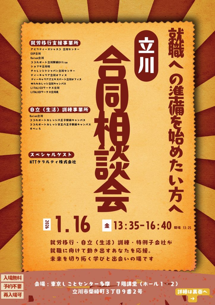 来る1月16日(金)に、東京しごとセンター多摩にて「立川合同相談会」が開催されます。このイベントは、就労移行支援や自立訓練の利用を検討されている方々を対象とした大規模な相談会です。