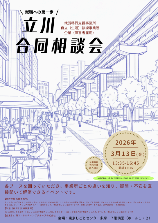 この度、立川エリアで活動する複数の就労移行支援事業所が集まり、合同で説明会を開催することになりました。
