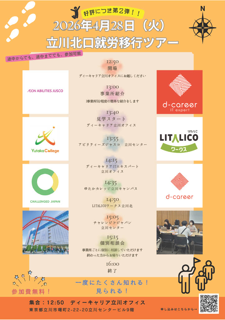 そこで、この度ご好評につき第2弾となる「立川北口就労移行支援ツアー」の開催が決定いたしました。このツアーが、あなたの新たな一歩を踏み出すきっかけとなることを願っています。